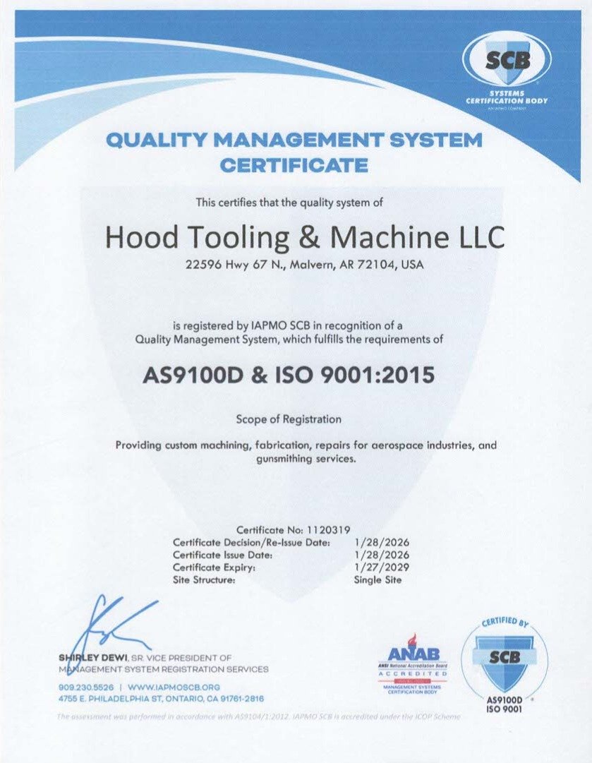 Hood Tooling & Machine LLC. operates a Quality Management System certified to AS9100D and ISO 9001 by SCB an ANAB-accredited certification body.